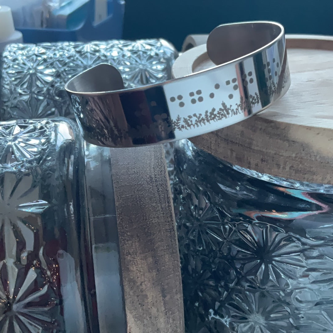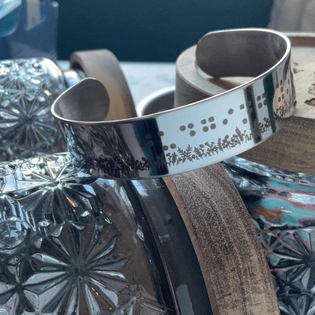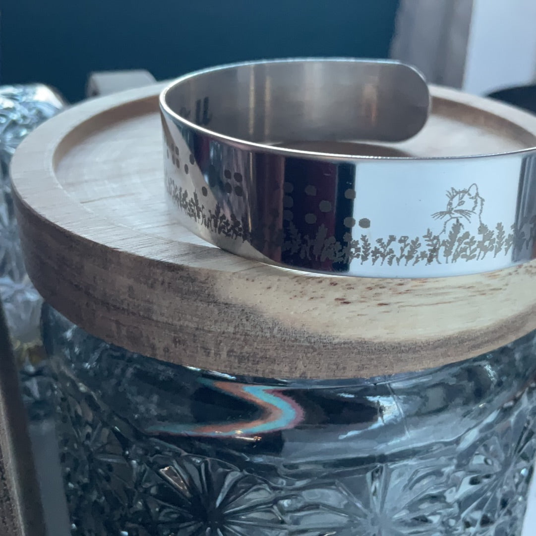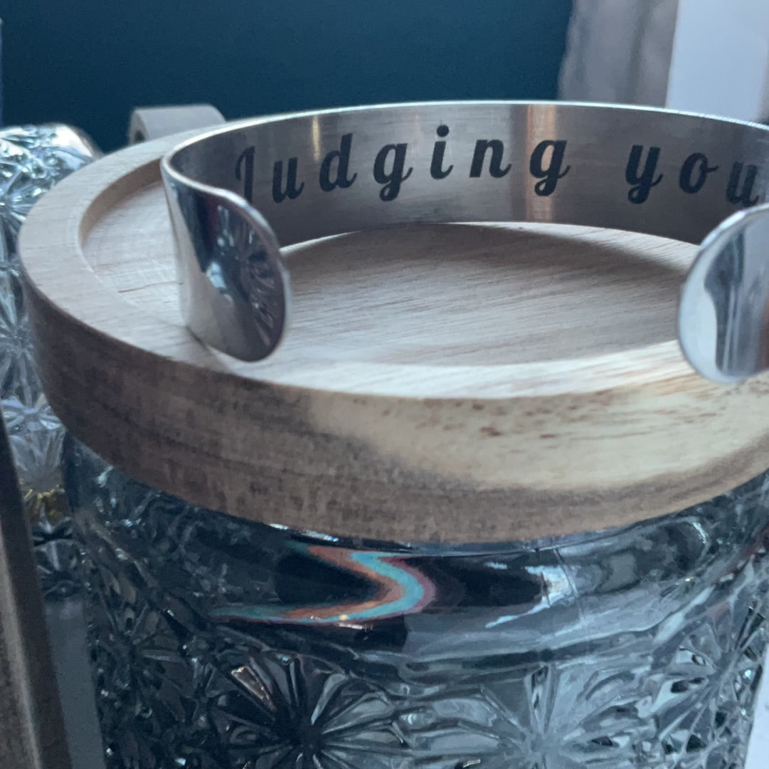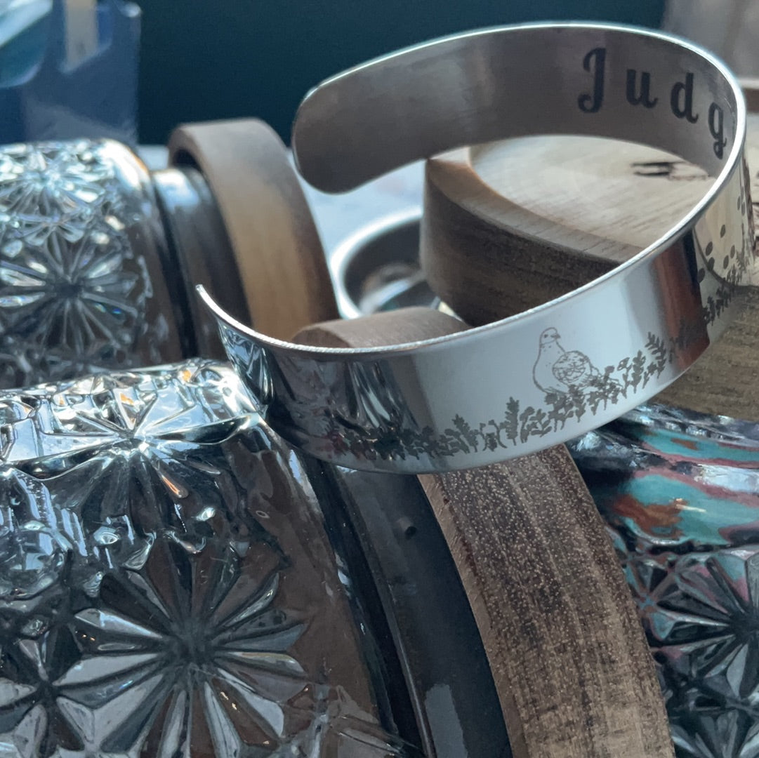 "Rock this stainless steel bracelet, engraved with "judging you" in braille, as a playful nod to the cat and pigeon staring each other down in a field. Perfect for those who don't take themselves too seriously!"