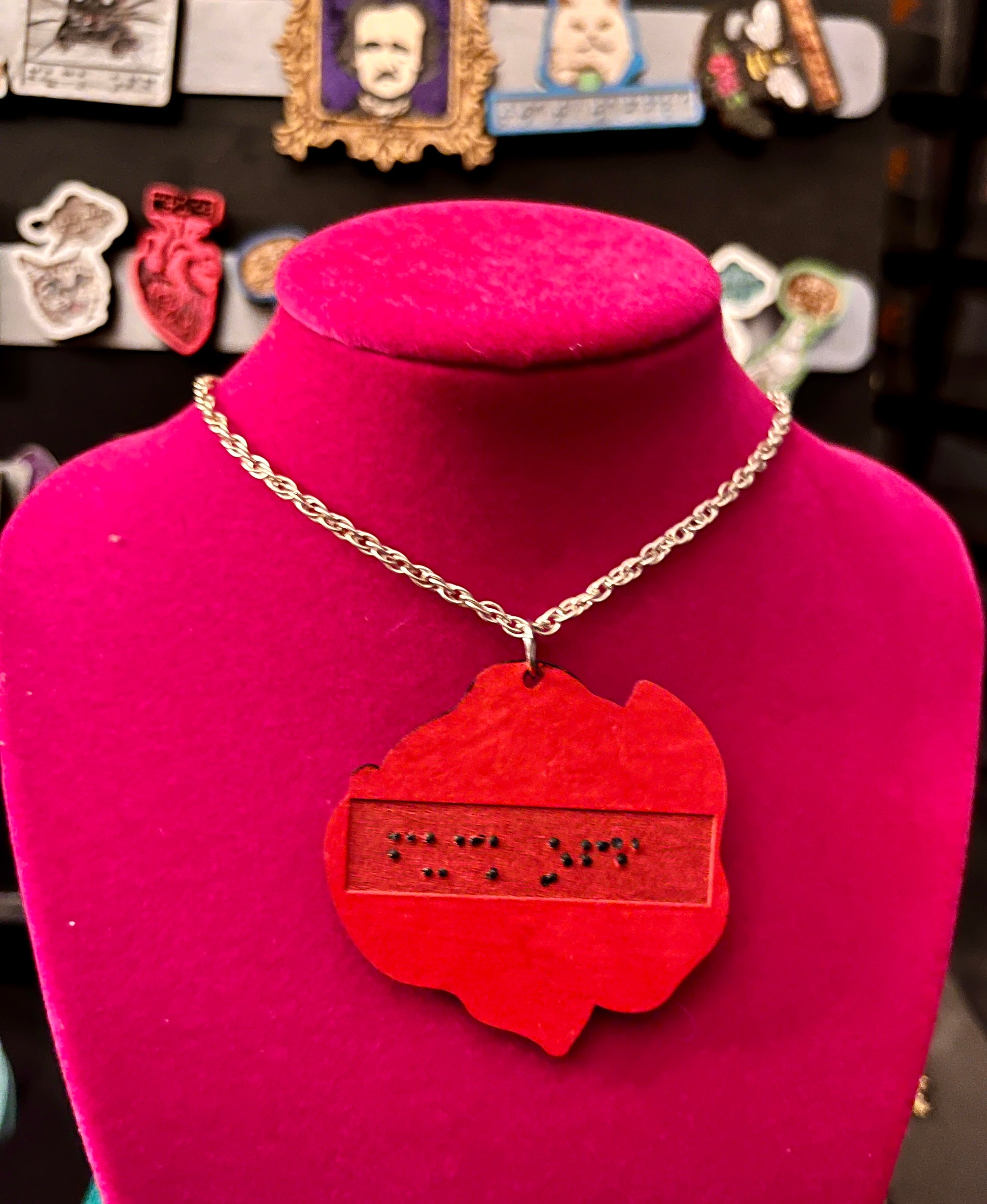 Add a vibrant touch of rebellious charm with Poppy, a one-of-a-kind handmade necklace. The 2 inch lightweight wood engraved pendant hangs on a silver plated chain and holds a playful message in Braille, making a bold statement - “fuck off.” Perfect for those who don't take themselves too seriously.
